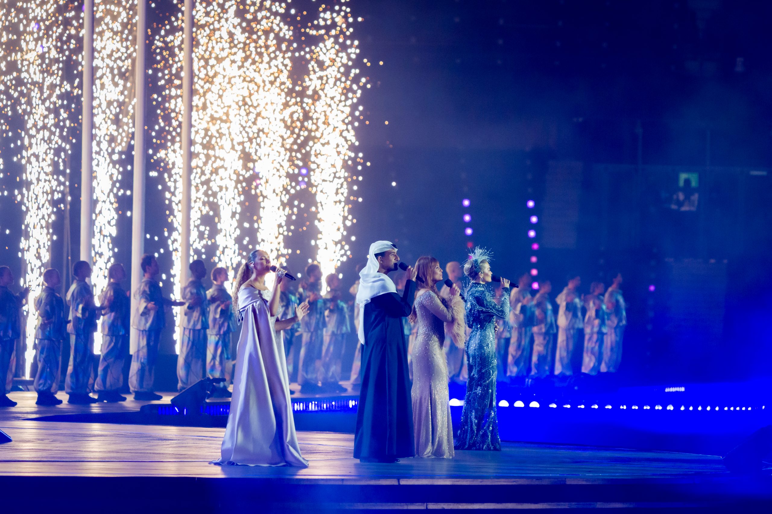 From the first moments, the ceremony leaned into contrast, traditional motifs rendered through contemporary stagecraft. A precisely choreographed  light show washed the stadium in shifting color and pattern, while scene-by-scene storytelling traced themes of journey, hospitality, and resilience, an artistic bridge between Abu Dhabi’s heritage and its global present.